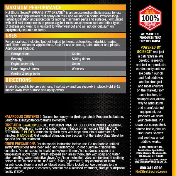 Hot Shot’s Secret Spray & Stay Grease is an aerosolized synthetic grease designed for everyday use in a variety of applications. This no-drip, no-mess formula provides long-lasting lubrication and protection against corrosion, rust, and moisture on moving parts and surfaces.