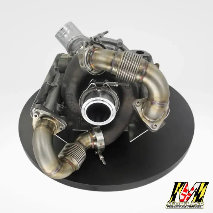 Upgrade your 2011-2014 Ford 6.7L Powerstroke with the Maryland Performance Budget VGT Retrofit Kit. This kit simplifies turbo upgrades by allowing installation without removing the OEM exhaust manifolds or downpipes, making it a cost-effective and efficient solution for improved performance.